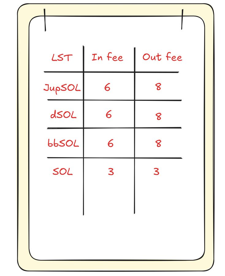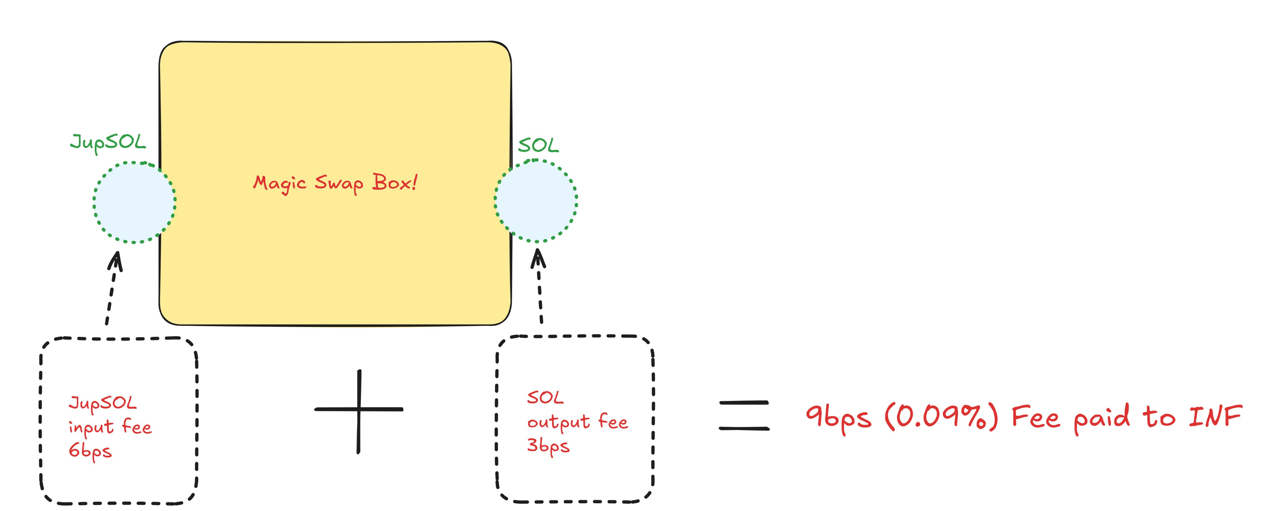 So, he tallies up the [Input fee] for JupSOL (6bps) with the [Output fee] for SOL (3bps) in the magic swap box, giving him the total fee to offer the swapper of 9 basis points.
