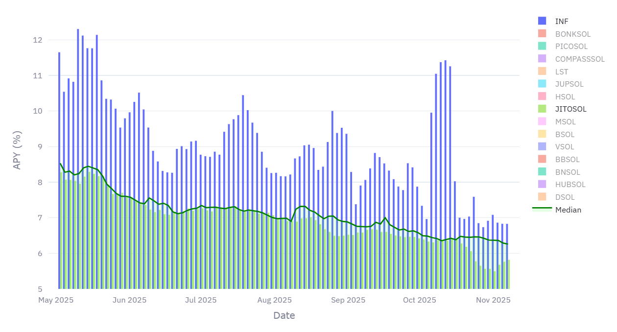 You can see INF (blue bar) considerably outperform the median LST (green line) and JitoSOL (green bar) this year.