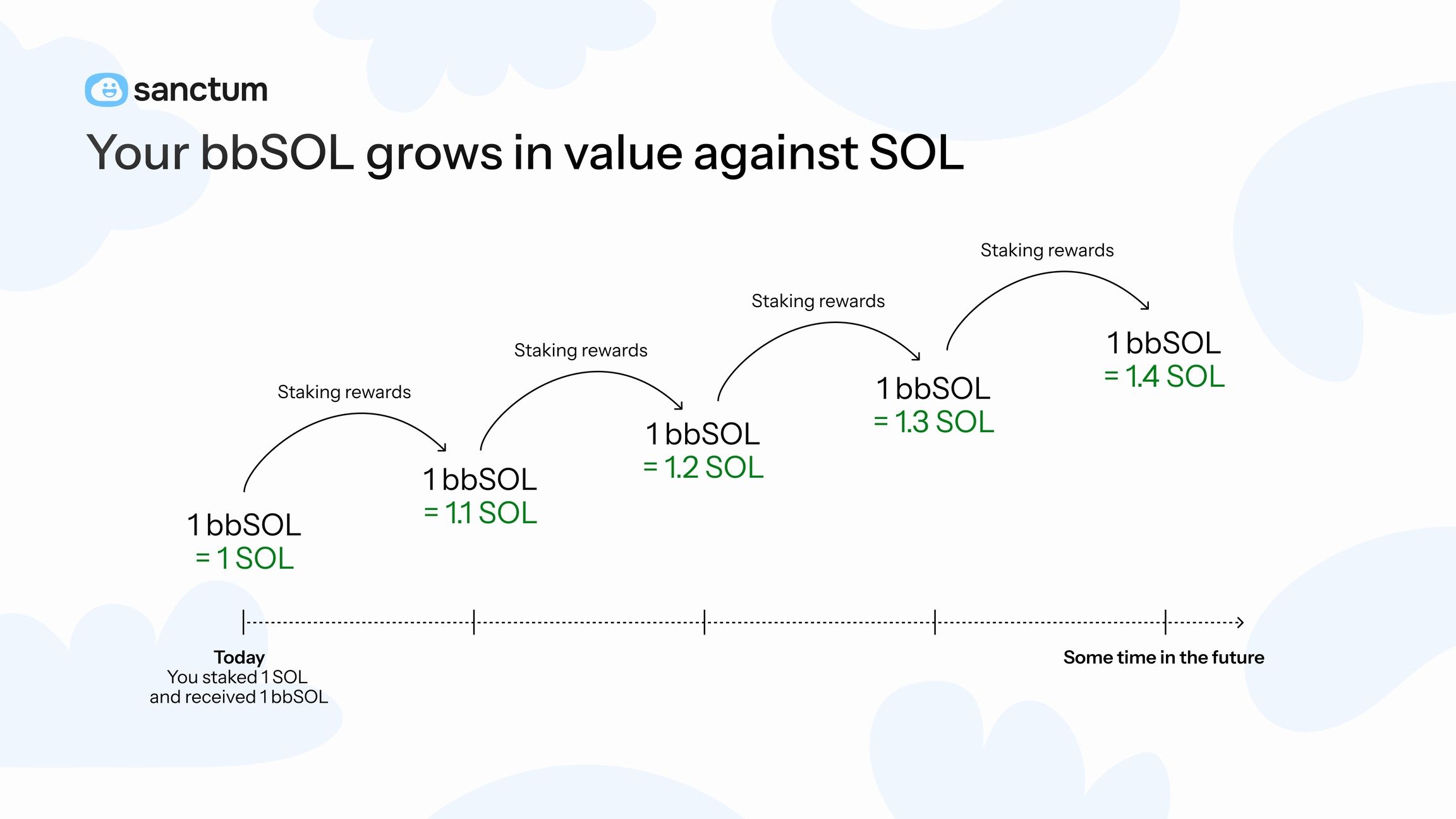 SOL that is deposited into bbSOL is staked. The staking rewards from that SOL accrue to the bbSOL token, which starts at 1:1 with SOL and grows in value over time. For example, if staking rewards are 10% p.a., then after a year, 1 bbSOL == 1.10 SOL. By simply holding bbSOL, you will earn staking rewards.