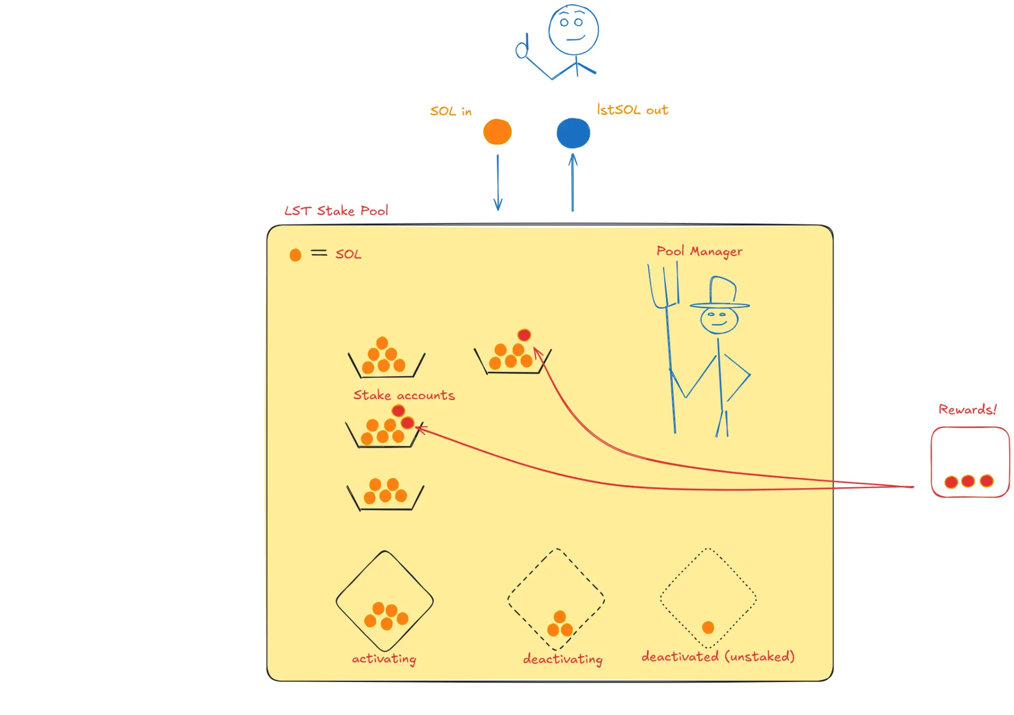 Inside this Stake Pool is where users’ staked SOL sits. This staked SOL is delegated to validators which are tasked with building blocks for the Solana network. The Stake Pool also has a Pool Manager whose job is to execute certain groundskeeping duties on behalf of the stake pool. Importantly, the Pool Manager’s duties are strictly defined and cannot withdraw the staked SOL from inside the pool.